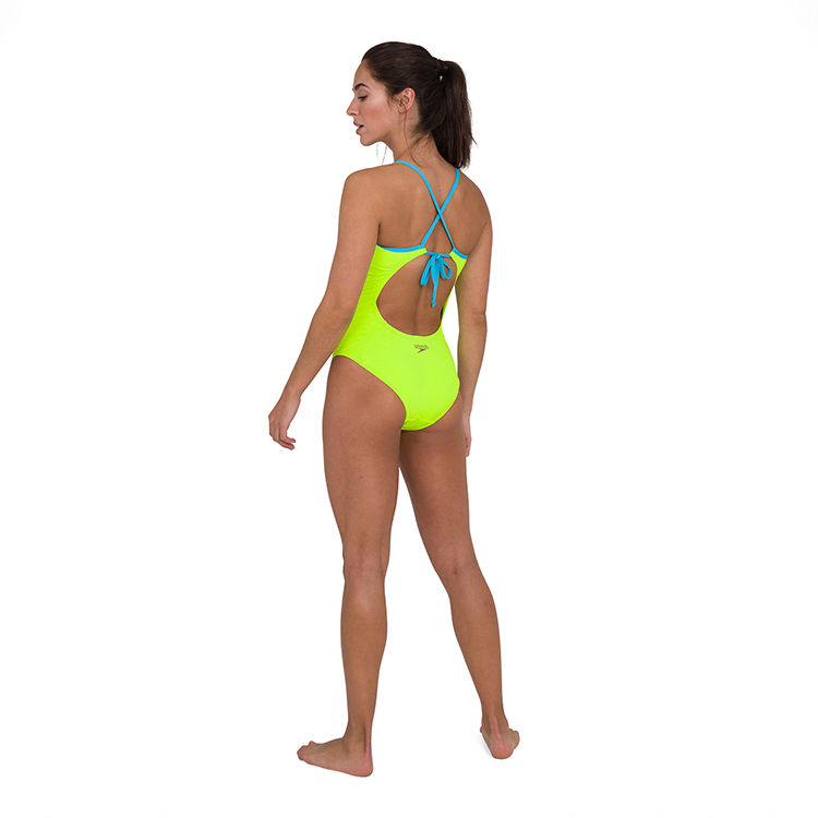 Dit Speedo Solid Tie-Back badpak fluoriserend geel & turquoise is een badpak waar comfort en prestaties perfect samengaan met deze kleurrijke Tie-Back. Het badpak heeft enkele smalle bandjes en biedt met de open rug en hoogopgesneden benen veel bewegingsvrijheid. Perfect voor de trainingen maar natuurlijk ook om gewoon baantjes in te zwemmen of naar het strand te dragen. Endurance®+ is een Speedo exclusief 100% chloorbestendig materiaal en blijft kleurecht.